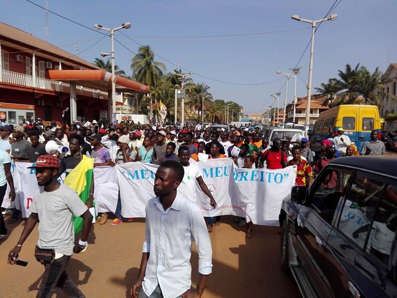 Os manifestantes, maioritariamente jovens, percorrem de forma pacífica as principais ruas da capital para exigir a demissão do Chefe do Estado, José Mário Vaz, apontado como o responsável pela crise política no país.